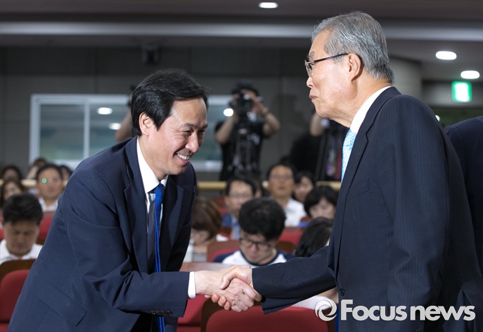 (서울=포커스뉴스) 30일 오후 서울 여의도 국회 의원회관에서 열린 더불어민주당 건강보험 부과체계 개편안 공청회에 참석한 김종인(오른쪽) 비대위 대표와 우상호 원내대표가 인사하고 있다.