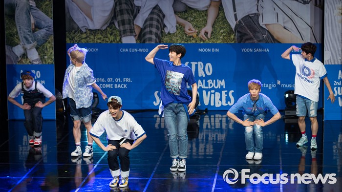 (서울=포커스뉴스) 30일 오후 서울 강남구 일지아트홀에서 열린 아이돌 그룹 아스트로의 두번째 미니앨범 'Summer Vibes' 발표 쇼케이스에 참여한 멤버들이 신곡무대를 선보이고 있다.