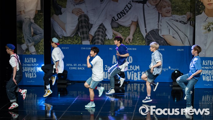 (서울=포커스뉴스) 30일 오후 서울 강남구 일지아트홀에서 열린 아이돌 그룹 아스트로의 두번째 미니앨범 'Summer Vibes' 발표 쇼케이스에 참여한 멤버들이 신곡무대를 선보이고 있다.