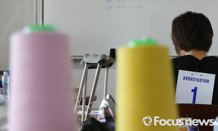 (청주=포커스뉴스) 30일 오후 충북 청주시 서원대학교에서 열린 충북 장애인기능경기대회 양복, 양장, 한복 종목 참가자가 과제를 수행하고 있다.