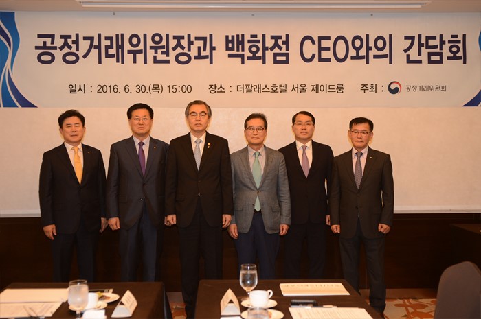 (서울=포커스뉴스) 정재찬 공정거래위원장이 30일 오후 서울 팔래스호텔에서 5개 백화점 CEO 간담회에 참석 기념촬영을 하고 있다. 왼쪽부터 정일채 AK백화점 대표, 황용득 갤러리아백화점 대표, 정재찬 공정위원장, 이원준 롯데백화점 대표, 장재영 신세계백화점 대표, 김영태 현대백화점 대표. <사진제공=공정거래위원회>