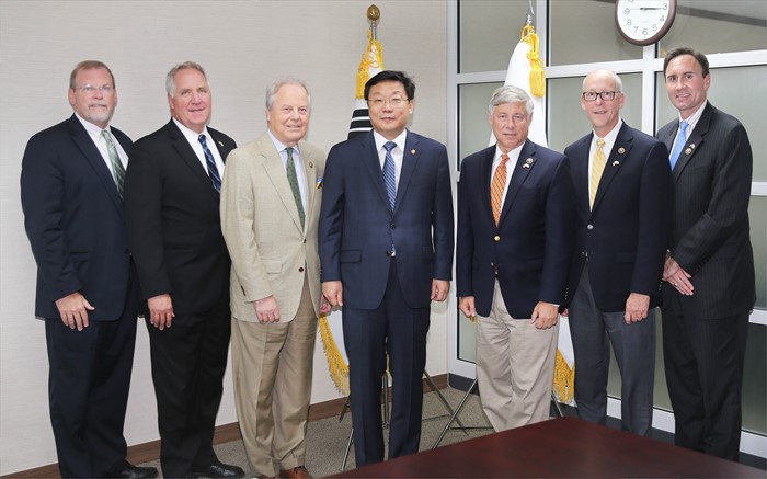 (서울=포커스뉴스) 주형환 산업통상자원부 장관이 30일 서울 외교부청사 집무실에서 프레드 업턴(Fred Upton) 美 연방 에너지·상업위 위원장 등 하원의원단의 예방에 앞서 기념촬영을 하고 있다. <사진제공=산업통상자원부>
