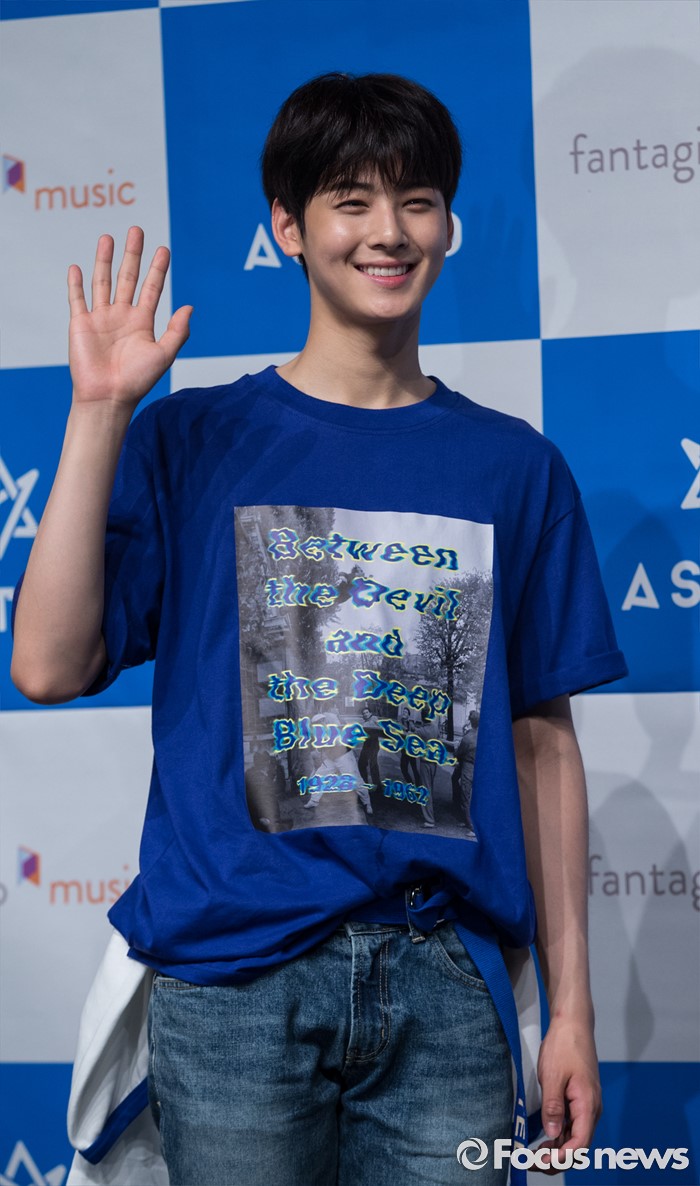 (서울=포커스뉴스) 30일 오후 서울 강남구 일지아트홀에서 열린 아이돌 그룹 아스트로의 두번째 미니앨범 'Summer Vibes' 발표 쇼케이스에 참여한 멤버 차은우가 포토타임을 갖고 있다.
