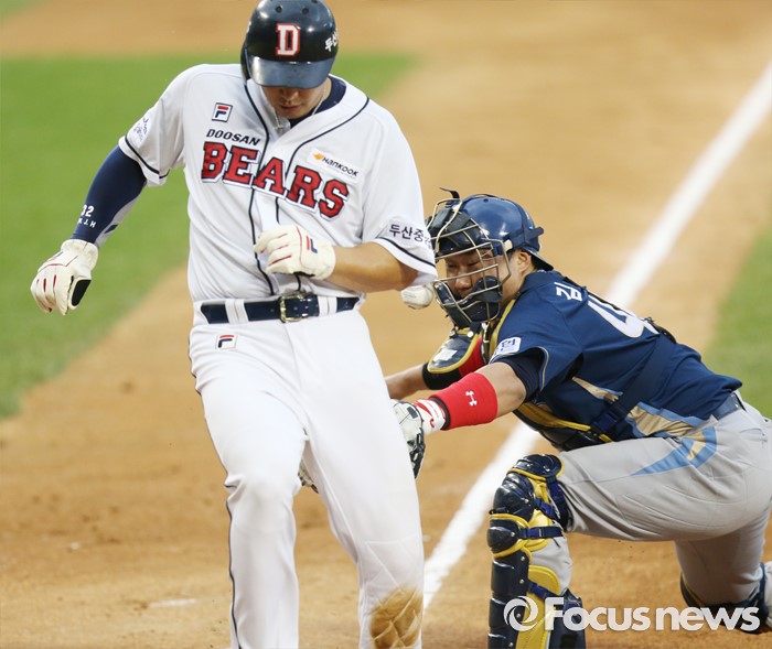 | △ 홈에서 세이프되는 두산 김재환 |