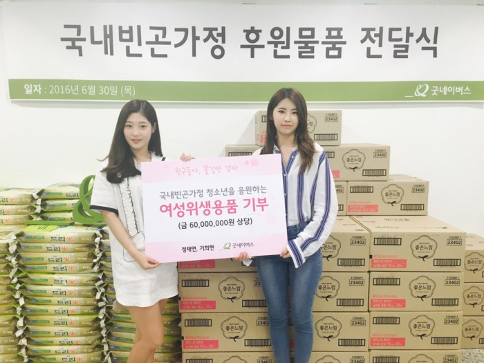 정채연과 기희현은 30일 오후 2시 굿네이버스 영등포본사에서 물품 기부식을 가졌다. 두 사람은 저소득층 청소년들을 위한 6000만원 상당의 여성위생용품을 굿네이버스를 통해 기부했다. 3000여명의 청소년들이 6개월여 동안 쓸 수 있는 물품이다.