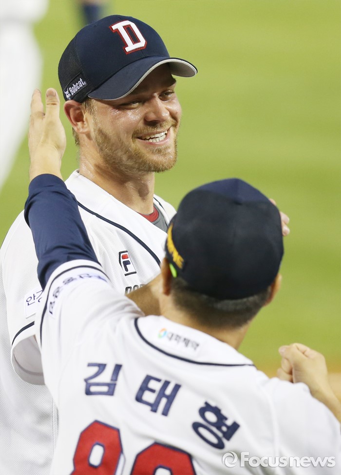 (서울=포커스뉴스) 30일 서울 잠실구장에서 열린 2016 프로야구 NC-두산 경기에서 두산 투수 보우덴이 9이닝 동안 139구를 던지며 KBO리그 역대 13번째 노히트노런을 달성하며 시즌 10승 고지에 올랐다. 김태형 감독이 축하해주고 있다.