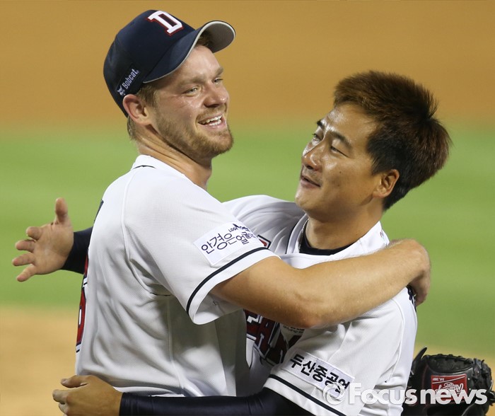 (서울=포커스뉴스) 30일 서울 잠실구장에서 열린 2016 프로야구 NC-두산 경기에서 두산 투수 보우덴이 9이닝 동안 139구를 던지며 KBO리그 역대 13번째 노히트노런을 달성하며 시즌 10승 고지에 올랐다. 정재훈과 포옹하고 있다.