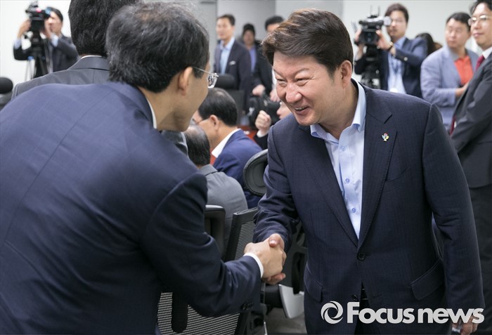 (서울=포커스뉴스) 권영진(오른쪽) 대구시장이 1일 오전 서울 여의도 국회 의원회관에서 영남권 신공항 백지화 및 대구 공군비행장 이전과 존치문제 등 논의를 위해 열린 새누리당 대구지역 의원들과의 간담회에 참석해 추경호 의원과 인사하고 있다.