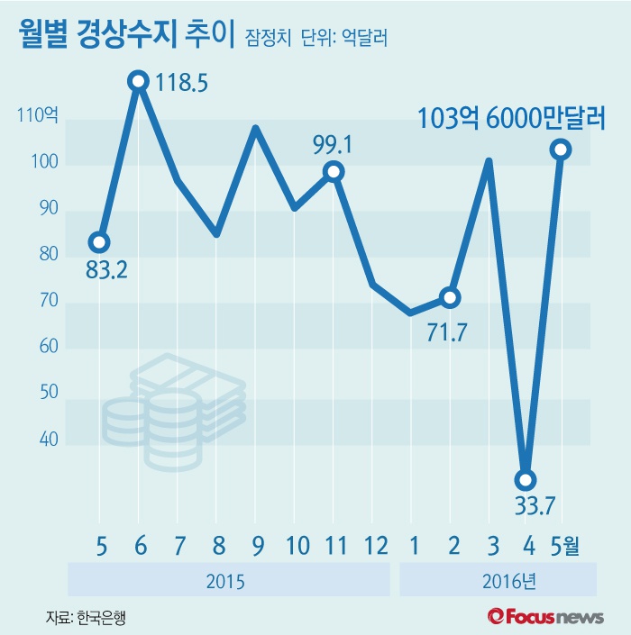 (서울=포커스뉴스) 1일 한국은행이 공개한 '5월 국제수지(잠정)'에 따르면 올 5월 경상수지는 103억6000만 달러 흑자를 기록했다. 경상수지는 2012년 3월 이후 51개월 연속 흑자행진을 하고 있다.