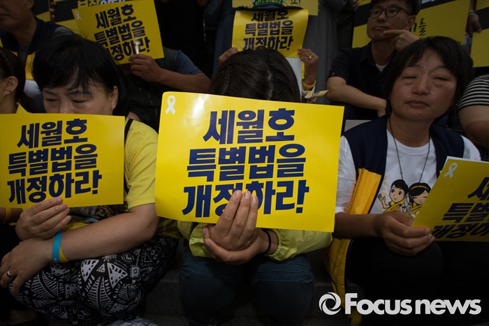 (서울=포커스뉴스) 1일 오전 서울 중구 나라키움저동빌딩 앞에서 열린 '세월호 특조위 성역없는 진상규명 조사 지속 지지 기자회견'에 참석한 416가족협의회와 4.16연대 회원들이 세월호 특별법 개정을 요구하는 손팻말을 들고 있다.