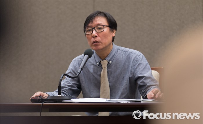 (서울=포커스뉴스) 이동열 투씨엠 대표가 1일 오전 서울 중구 프레스센터에서 열린 제2롯데월드 입면 표절의혹 기자회견에 참석해 발언하고 있다. 이 대표는 자사 디자인 '스타 컬렉션'을 45도 회전하면 제2롯데월드 에비뉴엘관의 디자인과 일치한다고 주장했다.
