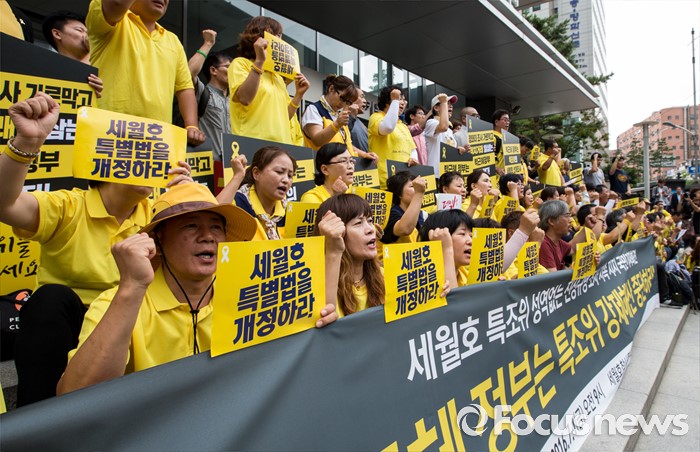 (서울=포커스뉴스) 1일 오전 서울 중구 나라키움저동빌딩 앞에서 열린 '세월호 특조위 성역없는 진상규명 조사 지속 지지 기자회견'에 참석한 416가족협의회와 4.16연대 회원들이 특조위 활동 보장을 요구하는 구호를 외치고 있다.