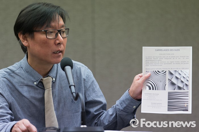 (서울=포커스뉴스) 이동열 투씨엠 대표가 1일 오전 서울 중구 프레스센터에서 열린 제2롯데월드 입면 표절의혹 기자회견에 참석해 발언하고 있다. 이 대표는 자사 디자인 '스타 컬렉션'을 45도 회전하면 제2롯데월드 에비뉴엘관의 디자인과 일치한다고 주장했다.