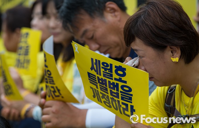 (서울=포커스뉴스) 1일 오전 서울 중구 나라키움저동빌딩 앞에서 열린 '세월호 특조위 성역없는 진상규명 조사 지속 지지 기자회견'에 참석한 416가족협의회와 4.16연대 회원들이 세월호 특별법 개정을 요구하는 손팻말을 들고 있다.