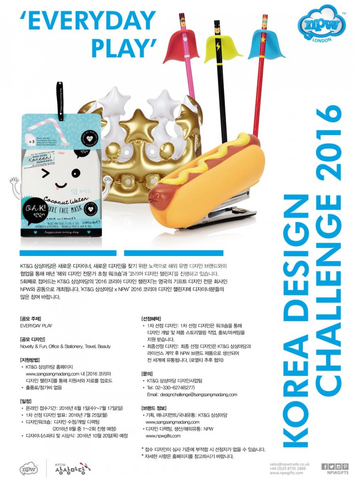 이번 '코리아 디자인 챌린지'의 주제는 '에브리데이 플레이(EVERYDAY PLAY, 매일 놀다)'이다. KT&G는 Novelty&Fun(참신함과 즐거움), Office&Stationery(사무실과 문방구), Travel(여행), Beauty(아름다움) 등 총 4개 부문에서 공모를 진행한다.