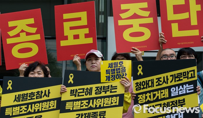 (서울=포커스뉴스) 1일 오전 서울 중구 나라키움저동빌딩 앞에서 열린 '세월호 특조위 성역없는 진상규명 조사 지속 지지 기자회견'에 참석한 416가족협의회와 4.16연대 회원들이 특조위 활동 보장을 요구하는 손팻말을 들고 있다.