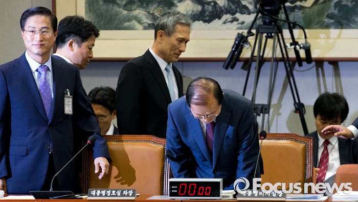 (서울=포커스뉴스) 1일 오전 서울 여의도 국회에서 열린 운영위원회 전체회의에 참석한 이원종 대통령비서실장이 자리에 앉기 앞서 인사하고 있다.