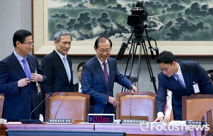 (서울=포커스뉴스) 1일 오전 서울 여의도 국회에서 열린 운영위원회 전체회의에 이원종(오른쪽 두번째부터) 대통령비서실장과 김관진 국가안보실장, 이영래 대통령경호실 차장 직무대리가 참석하고 있다.