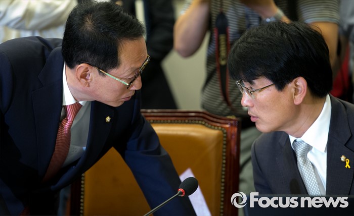 (서울=포커스뉴스) 1일 오전 서울 여의도 국회에서 열린 운영위원회 전체회의에 참석한 김도읍(왼쪽) 새누리당 간사와 박완주 더불어민주당 간사가 대화하고 있다.