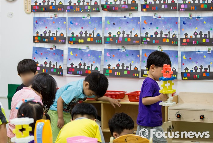 (서울=포커스뉴스) 어린이집을 종일반과 맞춤반으로 나눈 맞춤형 보육 제도가 시행된 1일 서울 성동구 신영창의어린이집에서 원아들이 수업을 하고 있다.