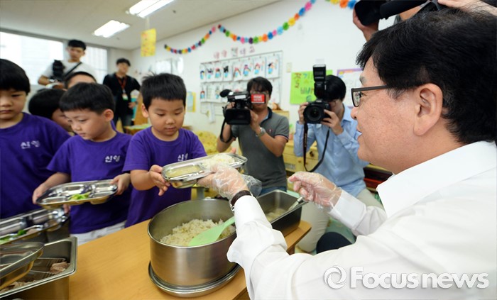 (서울=포커스뉴스) 어린이집을 종일반과 맞춤반으로 나눈 맞춤형 보육 제도가 시행된 1일 서울 성동구 신영창의어린이집을 방문한 정진엽 보건복지부 장관이 원아들에게 배식하고 있다.