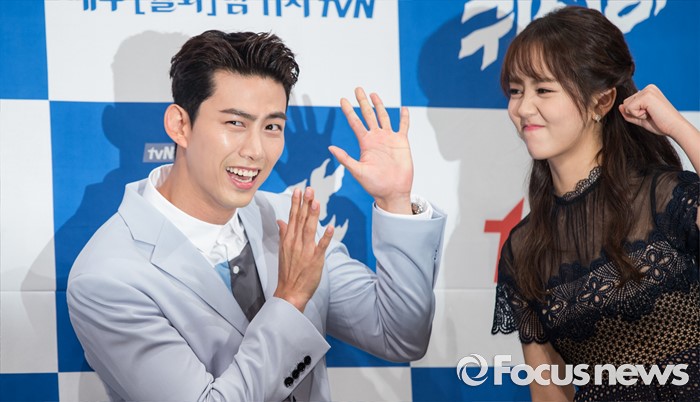 (서울=포커스뉴스) 1일 오후 서울 강남구 임피리얼 팰리스호텔에서 열린 tvN 월화드라마 '싸우자 귀신아' 제작발표회에 참석한 배우 옥택연(왼쪽)과 김소현이 포토타임을 갖고 있다.