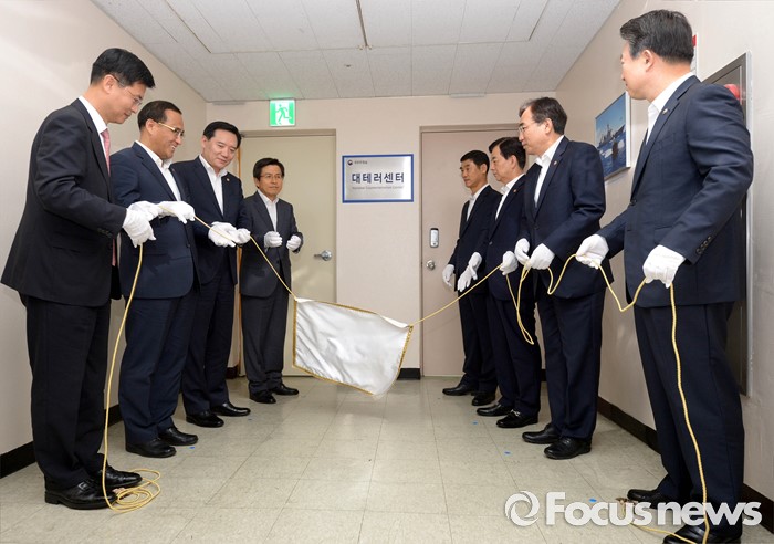 (서울=포커스뉴스) 황교안 국무총리를 비롯한 참석자들이 1일 오후 서울 종로구 정부서울청사에서 제1차 국가테러대책위원회를 마친 후 대테러센터 현판식을 하고 있다. 왼쪽부터 시계방향으로 최윤수 국정원 제2차장, 홍윤식 행정자치부 장관, 김현웅 법무부 장관, 황교안 국무총리, 문영기 대테러센터장, 한민구 국방부 장관, 이석준 국무조정실장, 강신명 경찰청장.