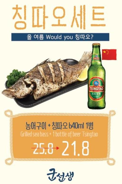 칭따오 숯불농어구이 세트의 가격은 2만1800원이며, 군선생 서울 사당본점, 남부터미널점, 건대점, 수유점 등 전국 11개매장에서 만나볼 수 있다.