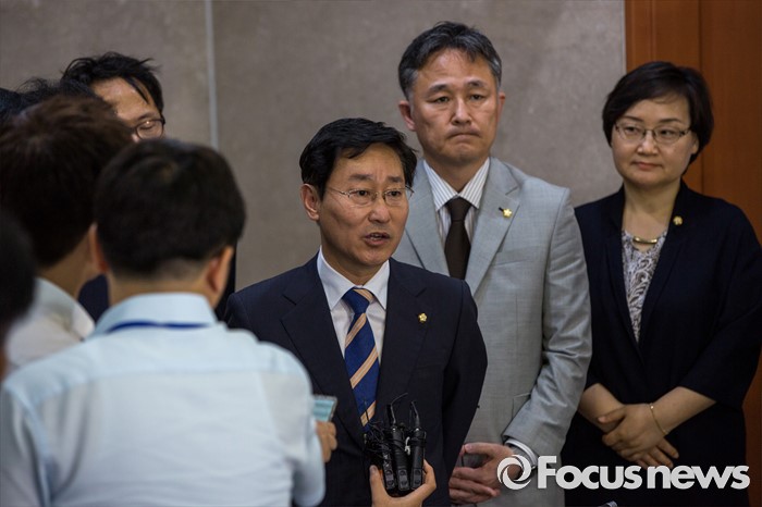 (서울=포커스뉴스) 1일 오후 서울 여의도 국회에서 더불어민주당 공정언론 특위 민주주의회복TF 소속 의원 및 국회 미래창조과학방송통신위원회 소속 의원들이 이정현 새누리당 의원의 청와대 홍보수석 재임시 KBS 보도 개입과 관련해 브리핑을 마친 뒤 취재진 질문에 답하고 있다.