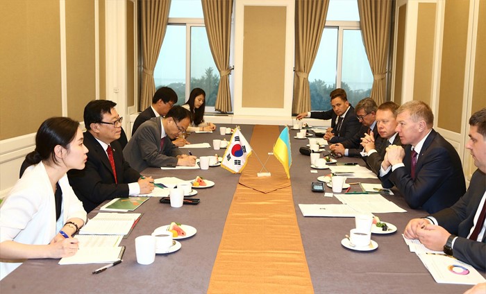 (서울=포커스뉴스) 이동필 농림축산식품부 장관이 1일 서울 여의도 국회의사당에서 세르기 라린 '한 - 우크라이나 의원친선협회' 회장을 만나 양국간 농업협력 현안에 대해 면담하고 있다. <사진제공=농림축산식품부>