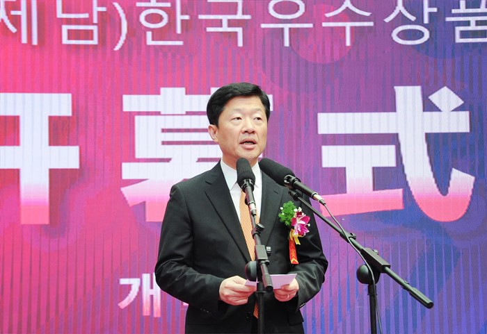 (서울=포커스뉴스) 우태희 산업통상자원부 2차관이 1일 중국 산동성 지난 국제컨벤션센터에서 샤겅(夏耕) 산동성 부성장, 정광영 KOTRA 부사장, 양웨이췬(杨伟群) 상무부아주사 부사장, 정진학 부산시 산업통상국장, 량롱(梁蓉) 중국상업연합회 부회장을 비롯한 한중 양국 정부 및 관계자들이 참석한 가운데 열린 '제남 한국상품전시회' 개막식에 참석해 축사를 하고 있다. <사진제공=산업통상자원부>