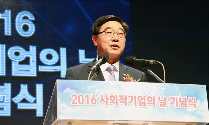 (서울=포커스뉴스) 이기권 고용노동부 장관이 1일 광주 김대중컨벤션센터에서 열린 2016 사회적기업 주간행사 및 사회적경제 박람회에 참석, 축사를 하고 있다. <사진제공=고용노동부>