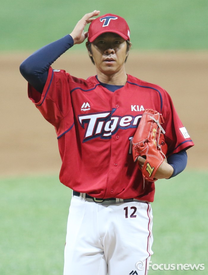 (서울=포커스뉴스) 1일 서울 고척 스카이돔에서 열린 2016 프로야구 KIA-넥센 경기 4회말 2사 1루에서 KIA 임창용이 도박 파문으로 인한 리그 50% 출장정지를 끝내고 등판해 넥센 김민성을 상대로 투구하며 모자를 고쳐 쓰고 있다.
