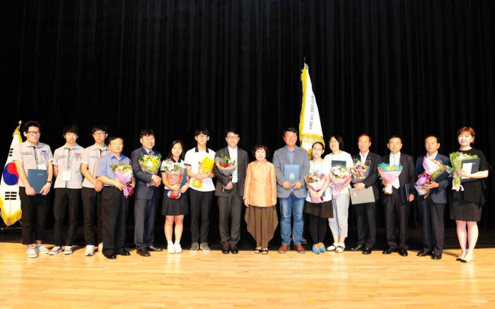 오는 3일까지 이틀동안 열리는 이번 대회는 전국에서 모인 문화재지킴이 400여 명이 사례발표를 통해 그간의 활동성과를 공유하고 활동 우수자에 대한 유공자 표창, 전주와 그 일대의 문화재 현장 정화활동 등으로 진행된다.나선화 문화재청장이 2일 오후 전북 전주 국립무형유산원에서 개최된 '2016년도 문화재지킴이 전국대회'에 참석해 문화재지킴이 활동 유공자 표창 후 기념사진 촬영을 하고 있다.<사진제공=문화재청>