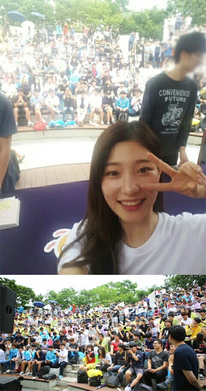 공개된 사진에는 많은 비가 내리는 가운데 팬 사인회와 버스킹을 진행하고 있는 다이아의 모습이 담겨있다.