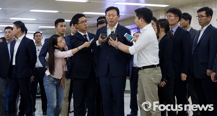 (서울=포커스뉴스) 신동빈 롯데그룹 회장이 3일 오후 서울김포공항을 통해 귀국, 취재진의 질문에 답하고 있다. 신 회장은 이날 기자들에게 최근 롯데그룹을 둘러싼 일련의 사태에 대해 "죄송하다"고 공식 사과 했다.