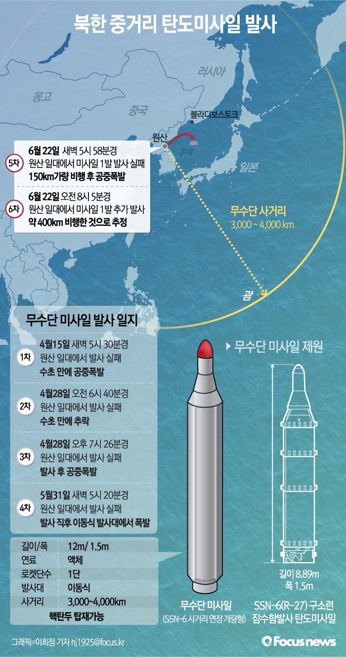 앞서 우리 합동참모본부는 "우리 군은 북한 전략군절(3일) 및 미국 독립기념일(4일)을 빌미로 하는 북한의 특이 군사동향을 예의 주시하고 있다"고 밝힌 바 있다.북한이 22일 오전 무수단 미사일로 추정되는 발사체를 2발 발사했다. 첫 번째 미사일은 150km가량 비행 후 공중폭발해 발사 실패로 추정됐고, 두 번째 발사한 미사일은 약 400km 비행한 것으로 추정됐다. 현재 한국과 미군 당국이 두 번째 미사일의 성공 여부에 대해 정밀 분석 중이다. 2016.06.22 이희정 기자