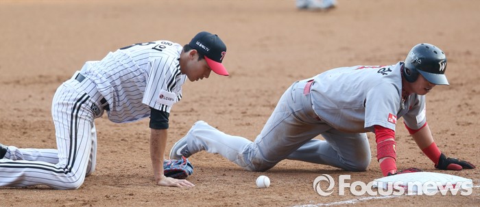 (서울=포커스뉴스) 3일 서울 잠실구장에서 열린 2016 프로야구 SK-LG 경기 2회초 2사 1루에서 SK 1루주자 박재상이 최장민의 번트 헛스윙때 1루로 귀루하며 LG 1루수 김용의가 볼을 놓쳐 세이프되고 있다.