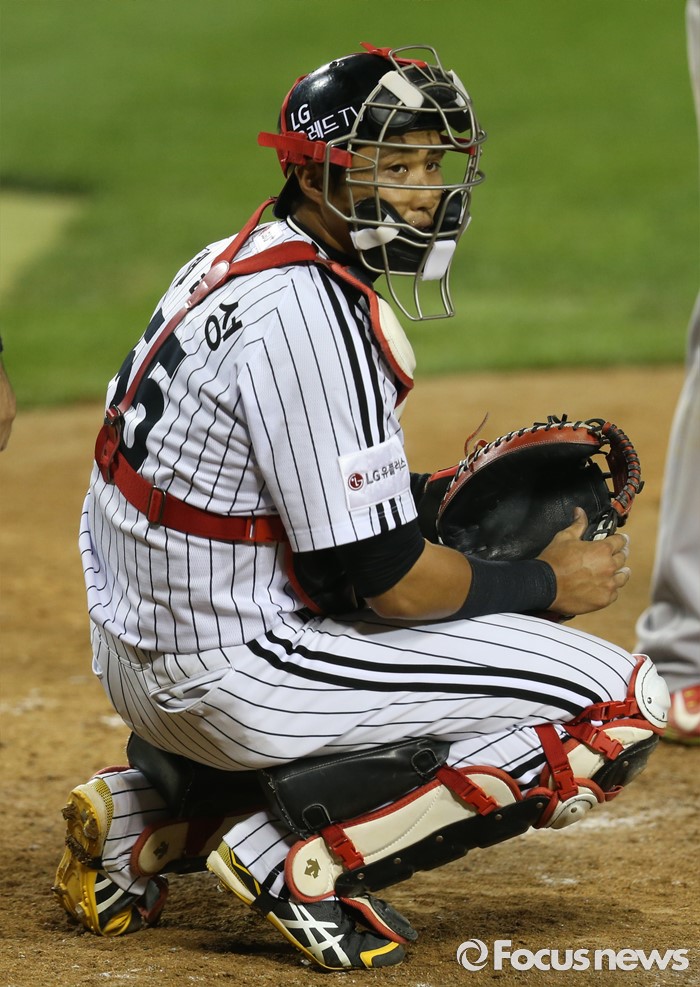 (서울=포커스뉴스) 3일 서울 잠실구장에서 열린 2016 프로야구 SK-LG 경기 9회초 LG 채은성이 포수 마스크를 쓰고 경기를 하고 있다.
