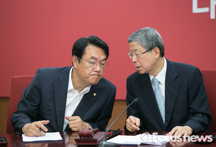 (서울=포커스뉴스) 4일 오전 서울 여의도 새누리당사에서 열린 혁신비상대책위원회의에 참석한 김희옥(오른쪽) 위원장과 정진석 원내대표가 대화하고 있다.