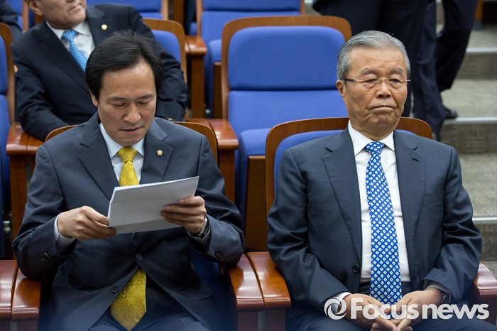 (서울=포커스뉴스) 김종인(오른쪽) 더불어민주당 비상대책위 대표와 우상호 원내대표가 4일 오전 서울 여의도 국회에서 열린 의원총회에 참석 하고 있다.