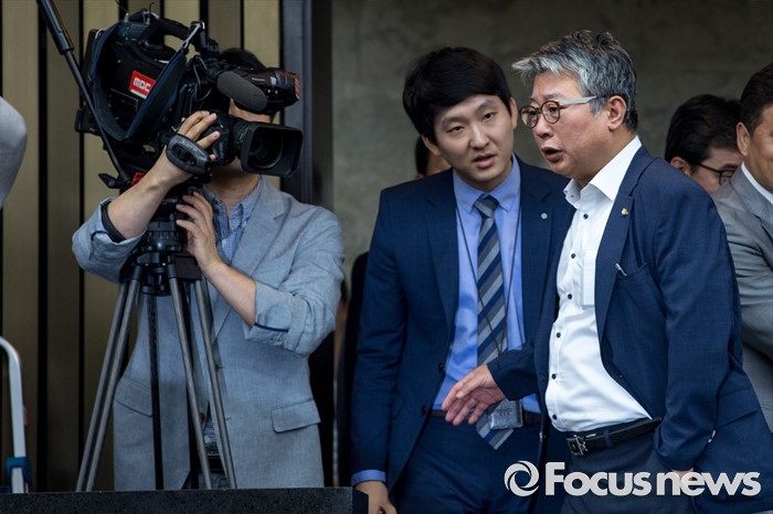 (서울=포커스뉴스) MBC 고위 간부가 성추행했다는 근거없는 사실을 주장해 명예훼손 논란에 휩싸인 조응천 더불어민주당 의원이 4일 오전 서울 여의도 국회에서 열린 의원총회에 참석하기 위해 회의실로 들어서고 있다.