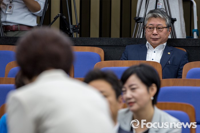 (서울=포커스뉴스) MBC 고위 간부가 성추행했다는 근거없는 사실을 주장해 명예훼손 논란에 휩싸인 조응천 더불어민주당 의원이 4일 오전 서울 여의도 국회에서 열린 의원총회에 참석하고 있다.