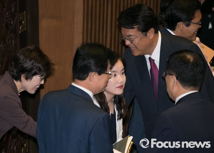 (서울=포커스뉴스) 4일 오전 서울 여의도 국회에서 열린 343회 국회(임시회) 6차 본회의, 경제에 관한 대정부 질문에 참석한 정진석 새누리당 원내대표가 의원들과 인사하고 있다.