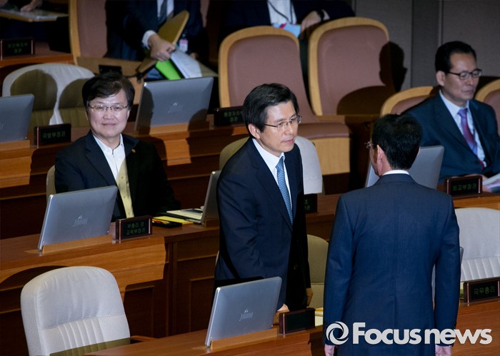 (서울=포커스뉴스) 4일 오전 서울 여의도 국회에서 열린 343회 국회(임시회) 6차 본회의, 경제에 관한 대정부 질문에 참석한 황교안(왼쪽) 국무총리와 김도읍 새누리당 원내수석부대표가 대화하고 있다.