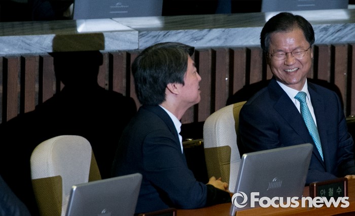 (서울=포커스뉴스) 4일 오전 서울 여의도 국회에서 열린 343회 국회(임시회) 6차 본회의, 경제에 관한 대정부 질문에 참석한 안철수(왼쪽), 천정배 국민의당 전 대표가 대화하고 있다.