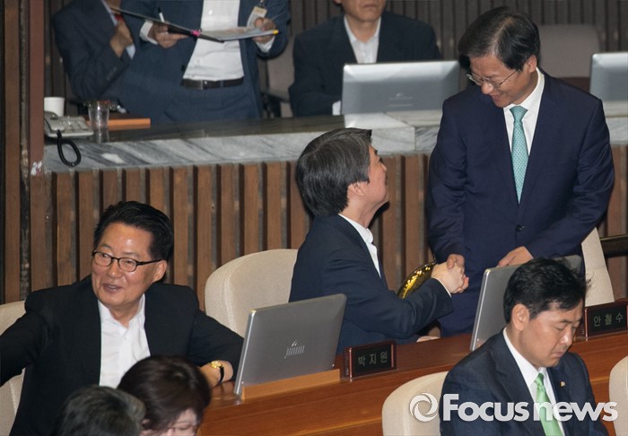 (서울=포커스뉴스) 4일 오전 서울 여의도 국회에서 열린 343회 국회(임시회) 6차 본회의, 경제에 관한 대정부 질문에 참석한 안철수(왼쪽), 천정배 국민의당 전 대표가 인사하고 있다.