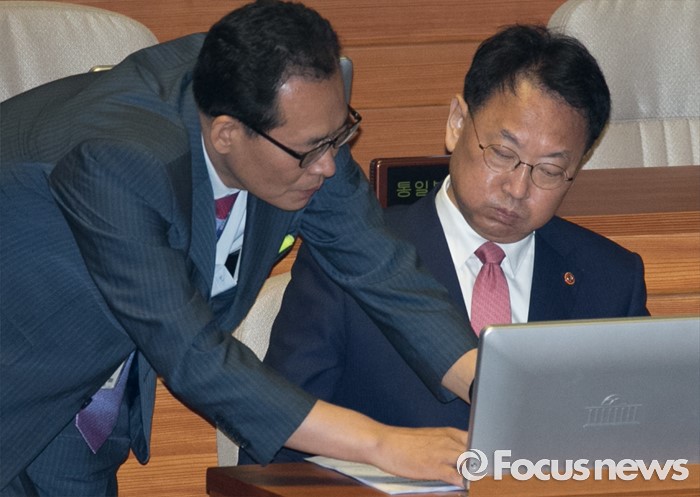 (서울=포커스뉴스) 4일 오전 서울 여의도 국회에서 열린 343회 국회(임시회) 6차 본회의, 경제에 관한 대정부 질문에 참석한 유일호 경제부총리 겸 기획재정부 장관이 관계자와 대화하고 있다.