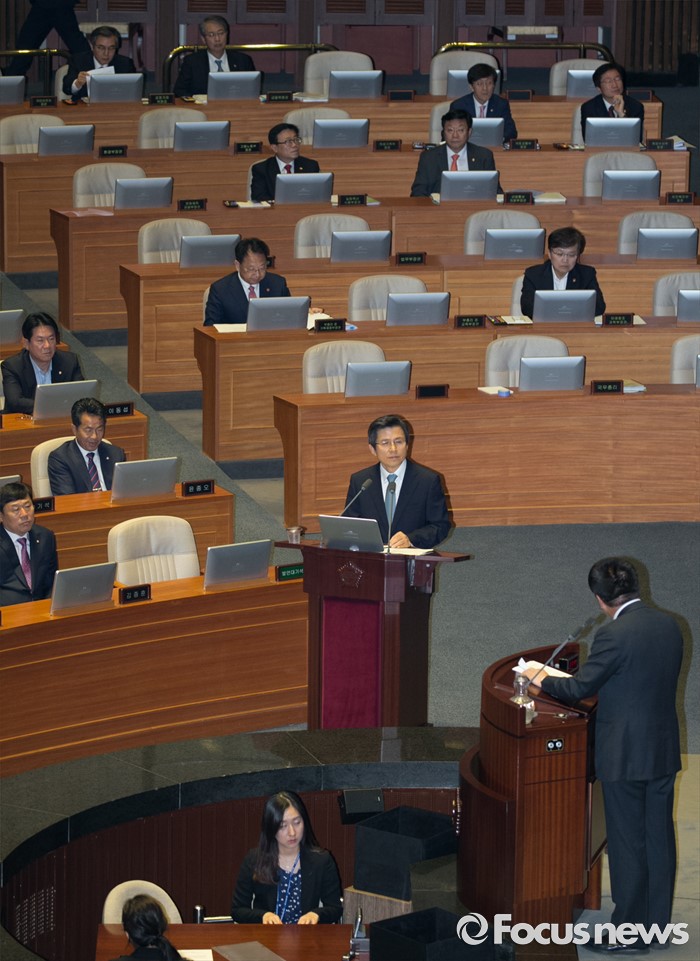 (서울=포커스뉴스) 4일 오전 서울 여의도 국회에서 열린 343회 국회(임시회) 6차 본회의, 경제에 관한 대정부 질문에 참석한 황교안 국무총리가 이종구 새누리당 의원의 질문에 답하고 있다.