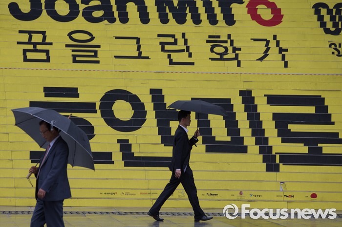 (서울=포커스뉴스) 전국에 호우주의보가 내려진 4일 오전 서울 종로구 광화문 광장에서 시민들이 우산을 들고 지나가고 있다.
